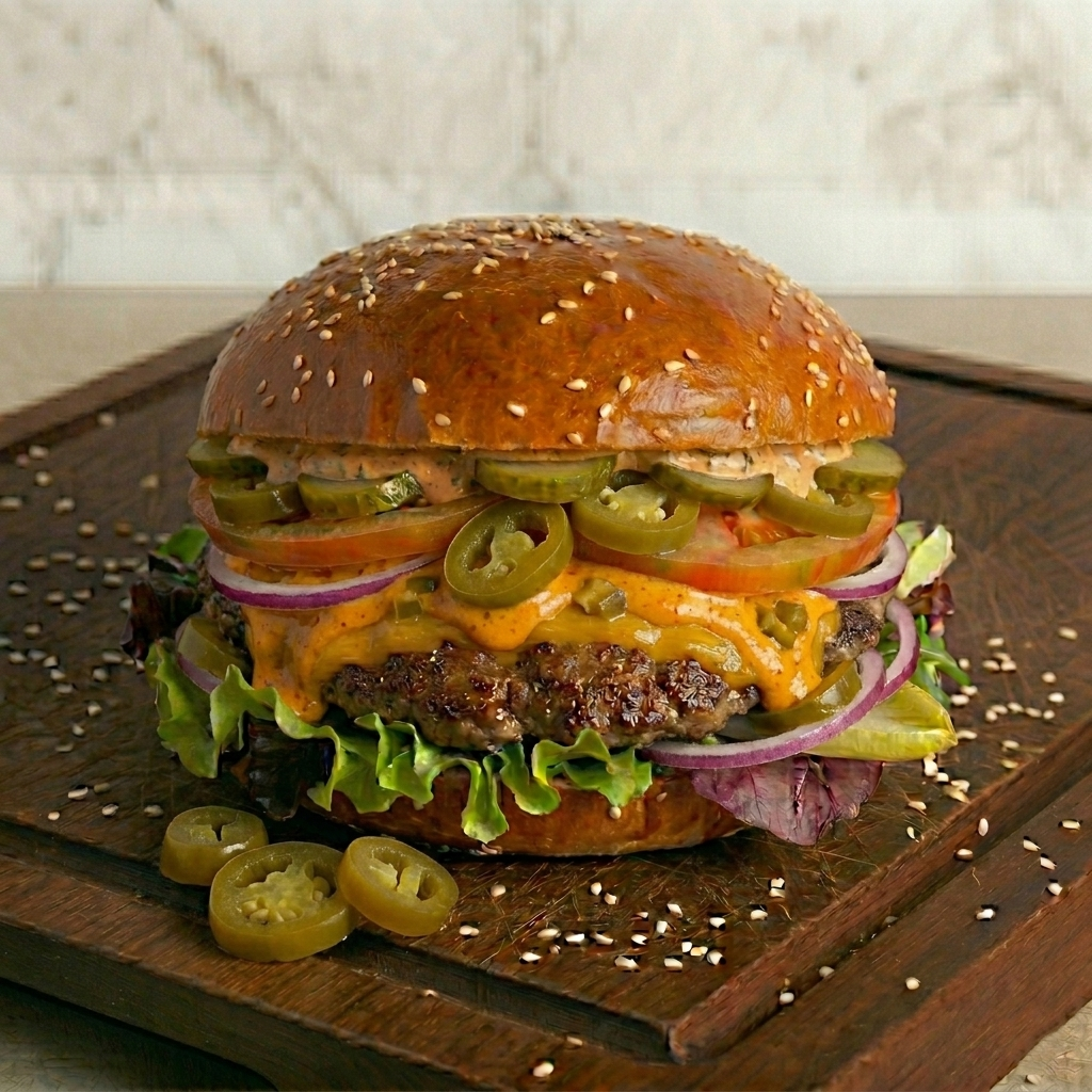 Beef, Jalapeños & Chili-Cheese-Sauce, Cheddar Käse, Salat, Tomate, Saure Gurke und Zwiebel