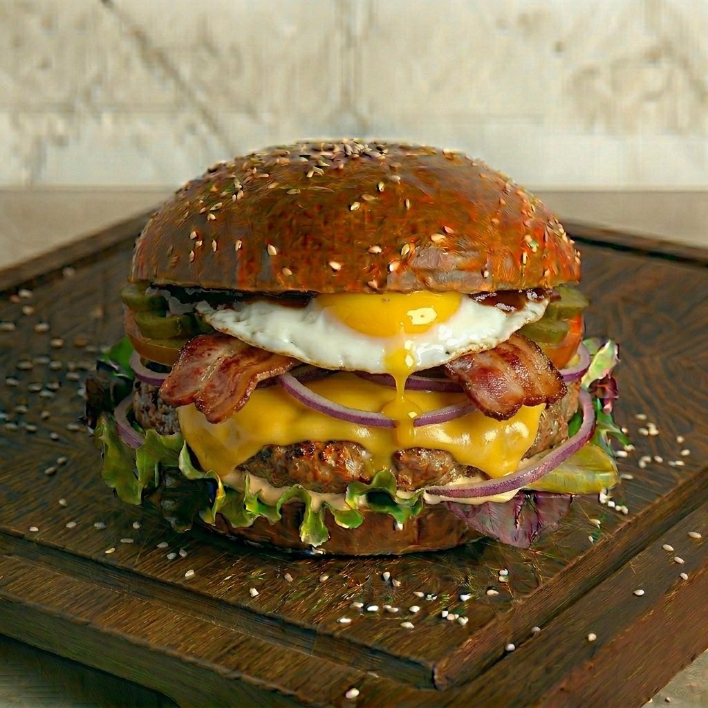 Beef, Sauce nach Wahl, Bacon, Ei, Cheddar Käse, Salat, Tomate, Saure Gurke und Zwiebel